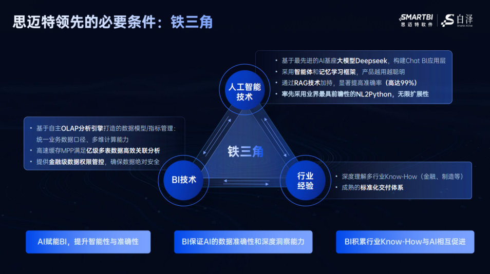 在實踐中,思邁特采用務實的“AI+BI雙軌策略”:有數據基礎的客戶直接上AI,充分利用積累;數據基礎不具備的先上BI打好基礎,再上AI。這避免了跨越式發展的風險。