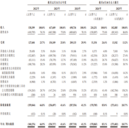 招股書顯示,在過(guò)去的2022年、2023年、2024年和2025年前六個(gè)月,智慧互通的營(yíng)業(yè)收入分別人民幣5.38億、6.18億、6.99億和1.03億元,相應(yīng)的凈虧損分別為人民幣3.60億、2.57億、2.88億和2.73億元。
