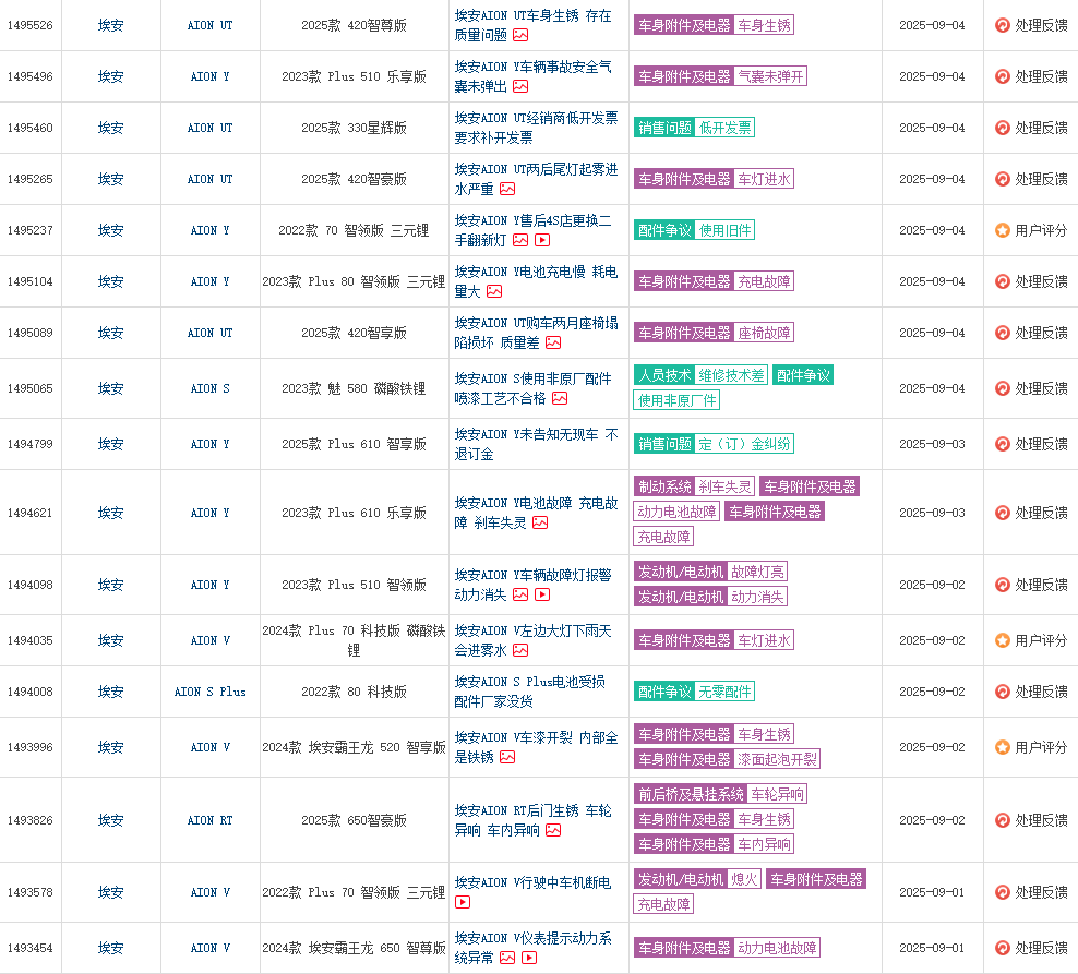 據車質網數據顯示,埃安旗下AION Y系列、AION S系列等多款主力車型都遭到大量投訴,包括但不限于動力系統故障、電機故障、車機卡頓/黑屏、續航嚴重縮水、車身生銹等問題。這些產品力層面的不足,直接動搖了消費者的購買信心。