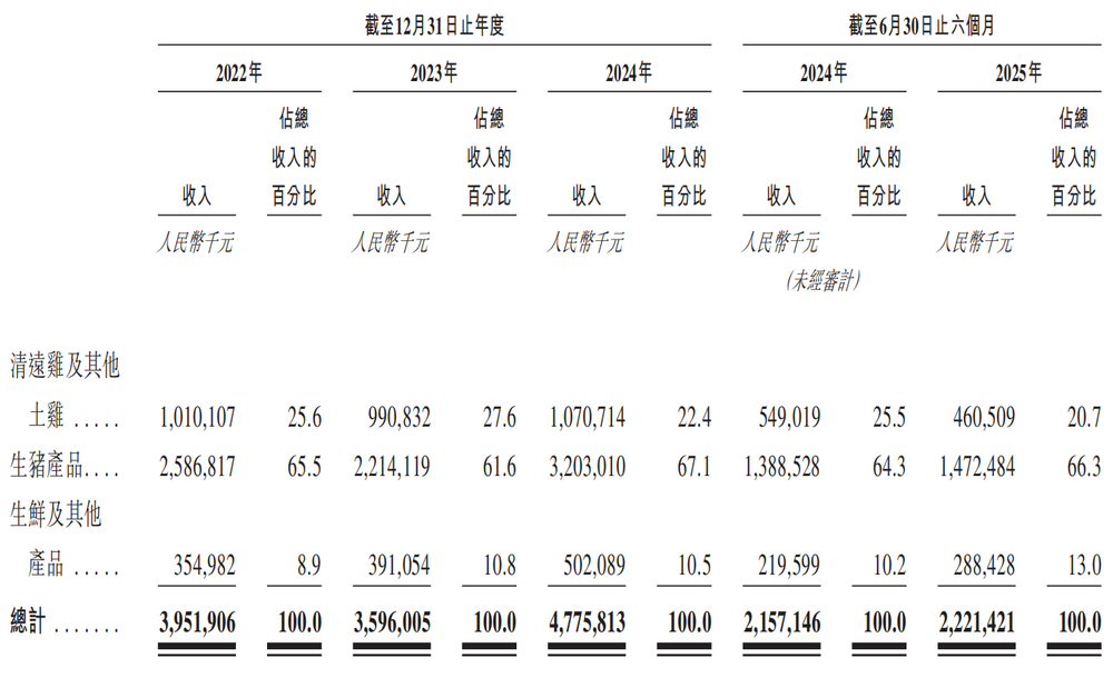 首先在收入占比上,2022年至2024年,公司生豬產(chǎn)品分別貢獻(xiàn)了65.5%、61.6%、67.1%的收入,同期清遠(yuǎn)雞及其他土雞的收入占比僅分別為25.6%、27.6%和22.4%,2025年上半年進(jìn)一步下降至20.7%。