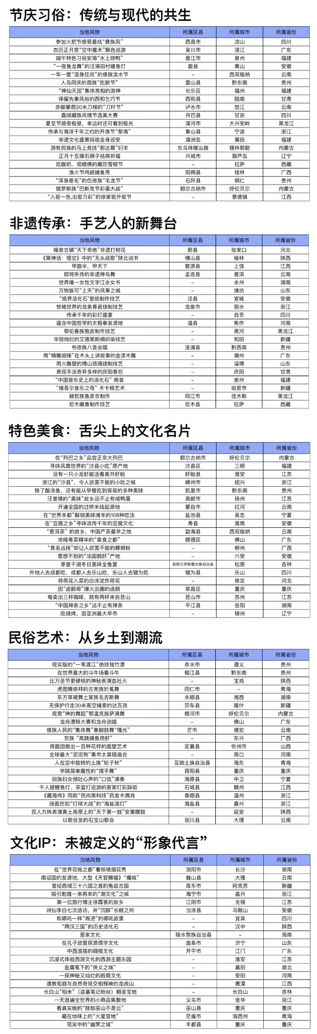 《中國風物報告》系統梳理了全國一百個獨特風物,涵蓋節慶習俗、非遺傳承、特色美食、民俗藝術和文化IP五大類別。涼山火把節上的最炫彝族風、世界唯一女性文字江永女書、濃縮粵菜精華的順德美味、現實版的“一葦渡江”絕技獨竹漂、和哪吒一樣“叛逆”的哪吒故里,五大主題系列全方位構建起了一份系統化的風物旅行體驗圖譜。