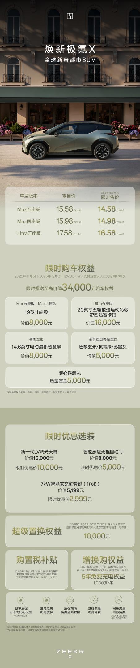 與此同時,極氪品牌新車首任車主增換購煥新極氪X,可享首任車主每年1000度的5年免費(fèi)充電權(quán)益。此外,2025年11月30日(含)前鎖單的用戶,若因極氪原因無法在2025年內(nèi)開票,極氪品牌提供至高15,000元的購置稅差額補(bǔ)貼。